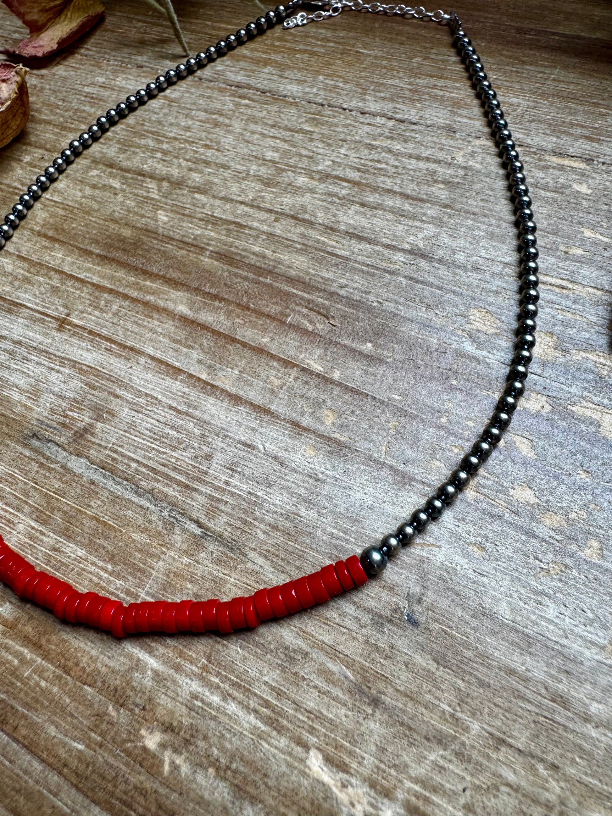 15-Inch Red Magnesite Heishi Necklace ā Sterling Silver Pearls, Handmade