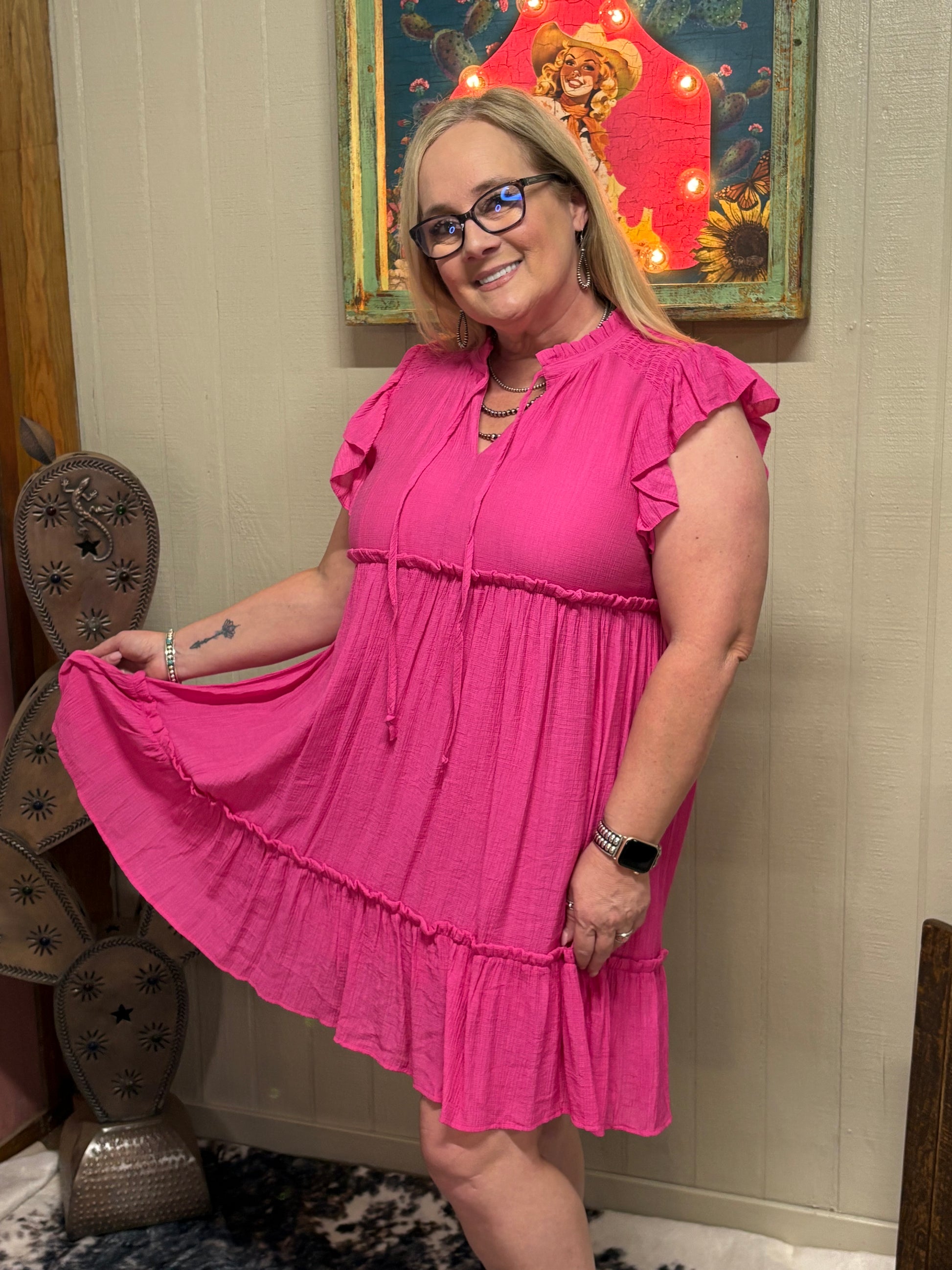 Turn heads and twirl freely in the Aleah Ruffled Dress. This tiered ruffle dress is all about feminine flair with a dash of southern sass. Designed in a vibrant hot pink hue, it features smocked shoulder details, a sweet tie-front neckline, and cascading tiers for that flirty, floaty movement we love. Crafted from a lightweight rayon-nylon blend, it's the perfect pick for sunny days and festive nights.