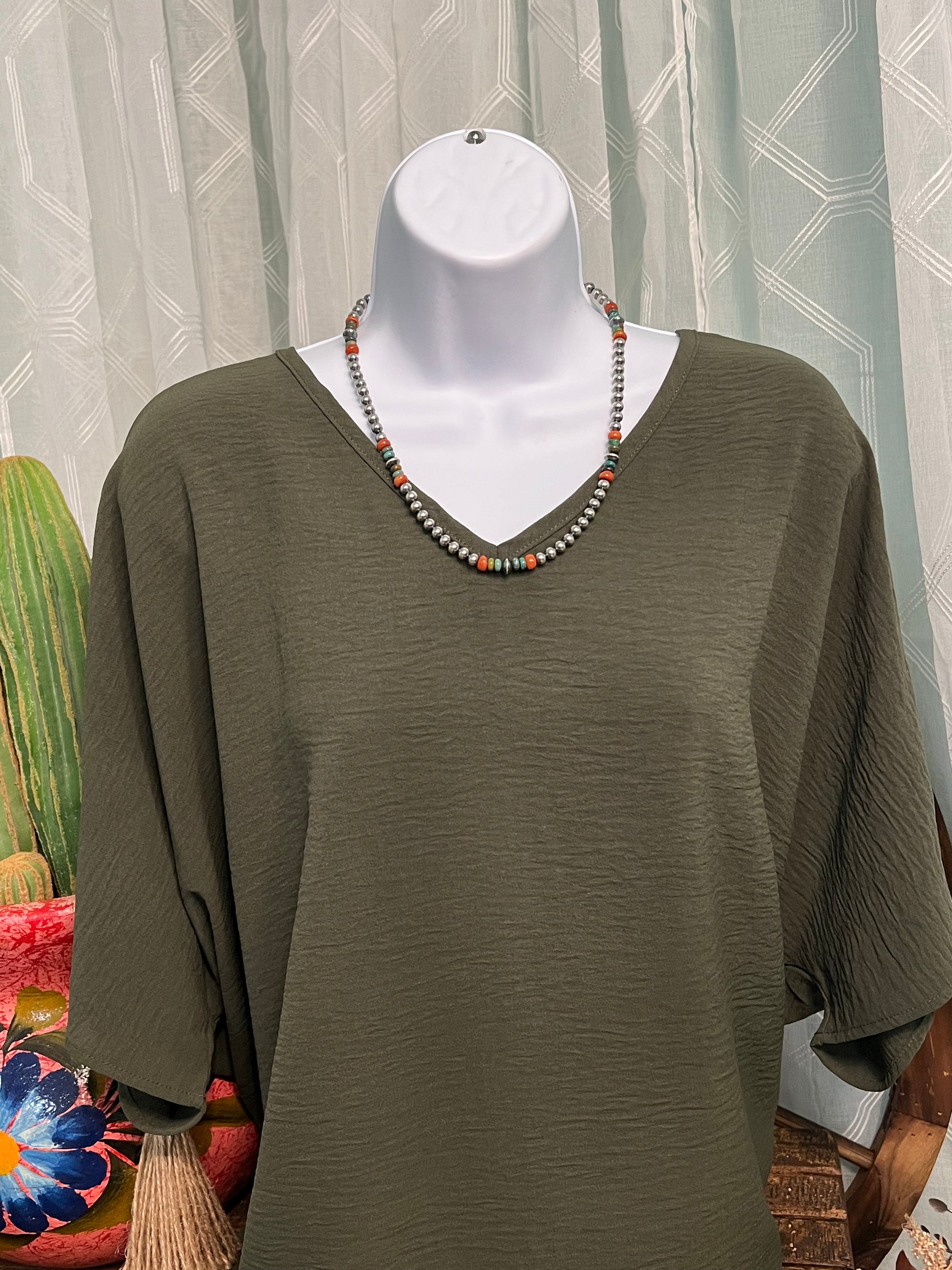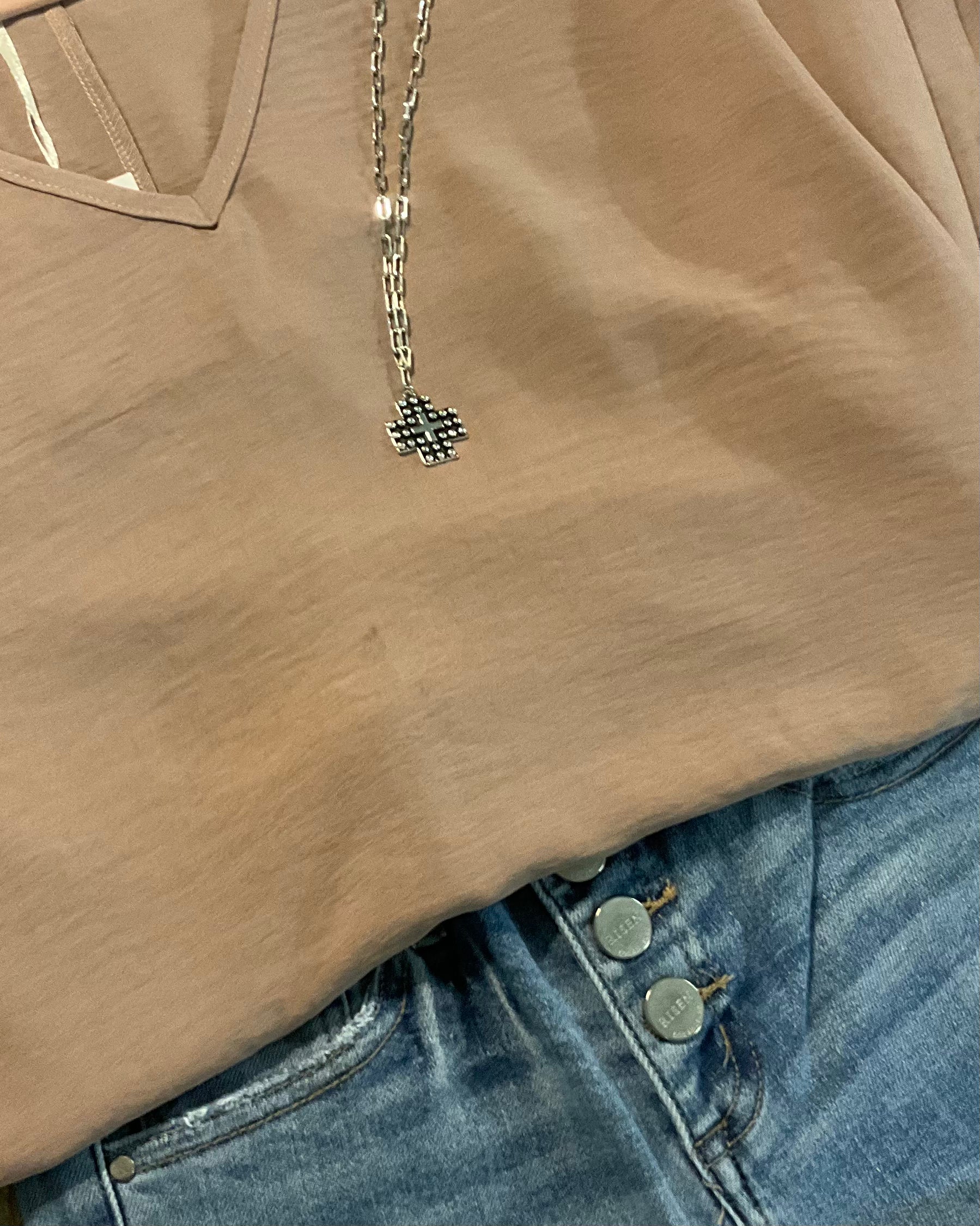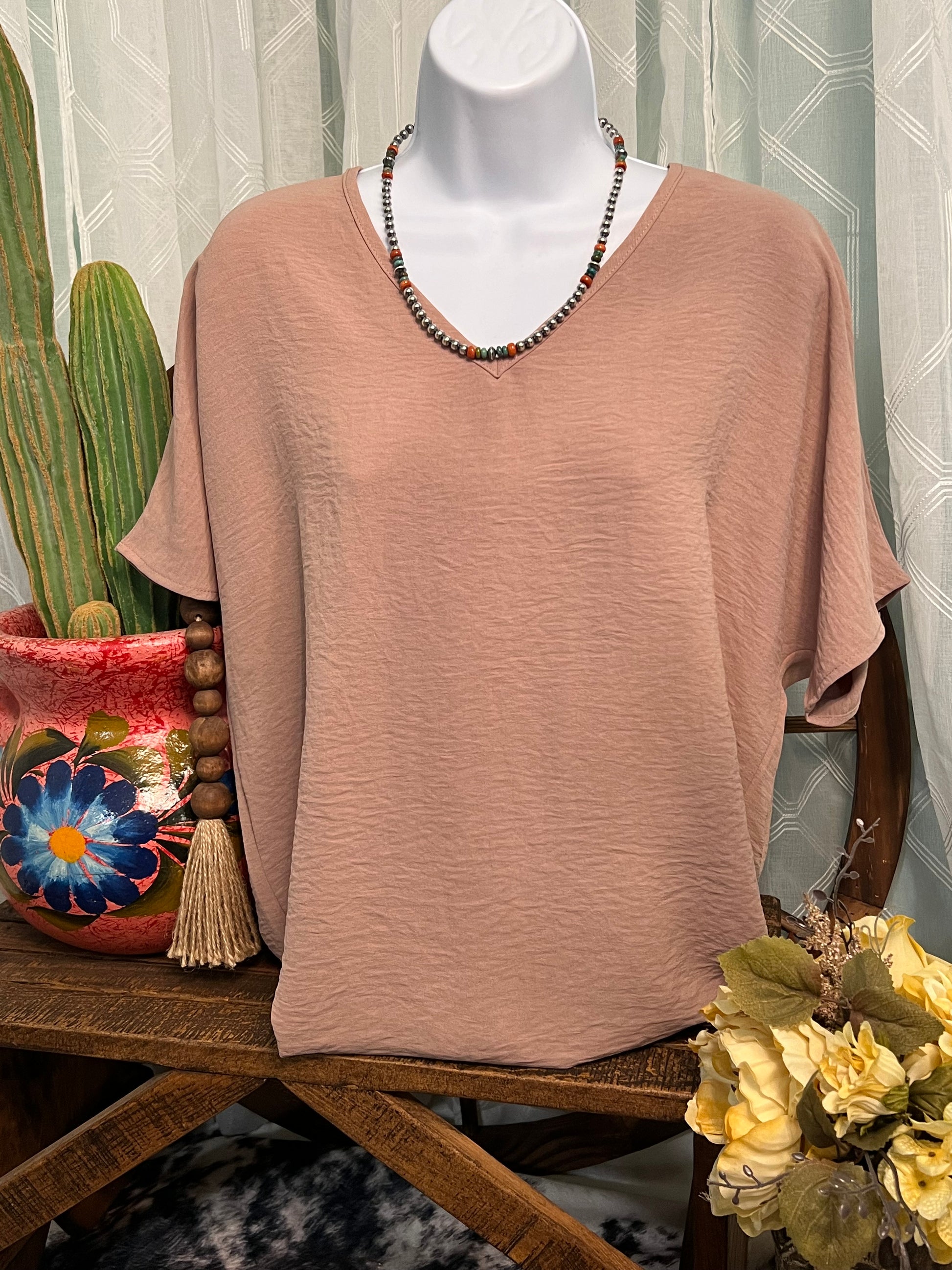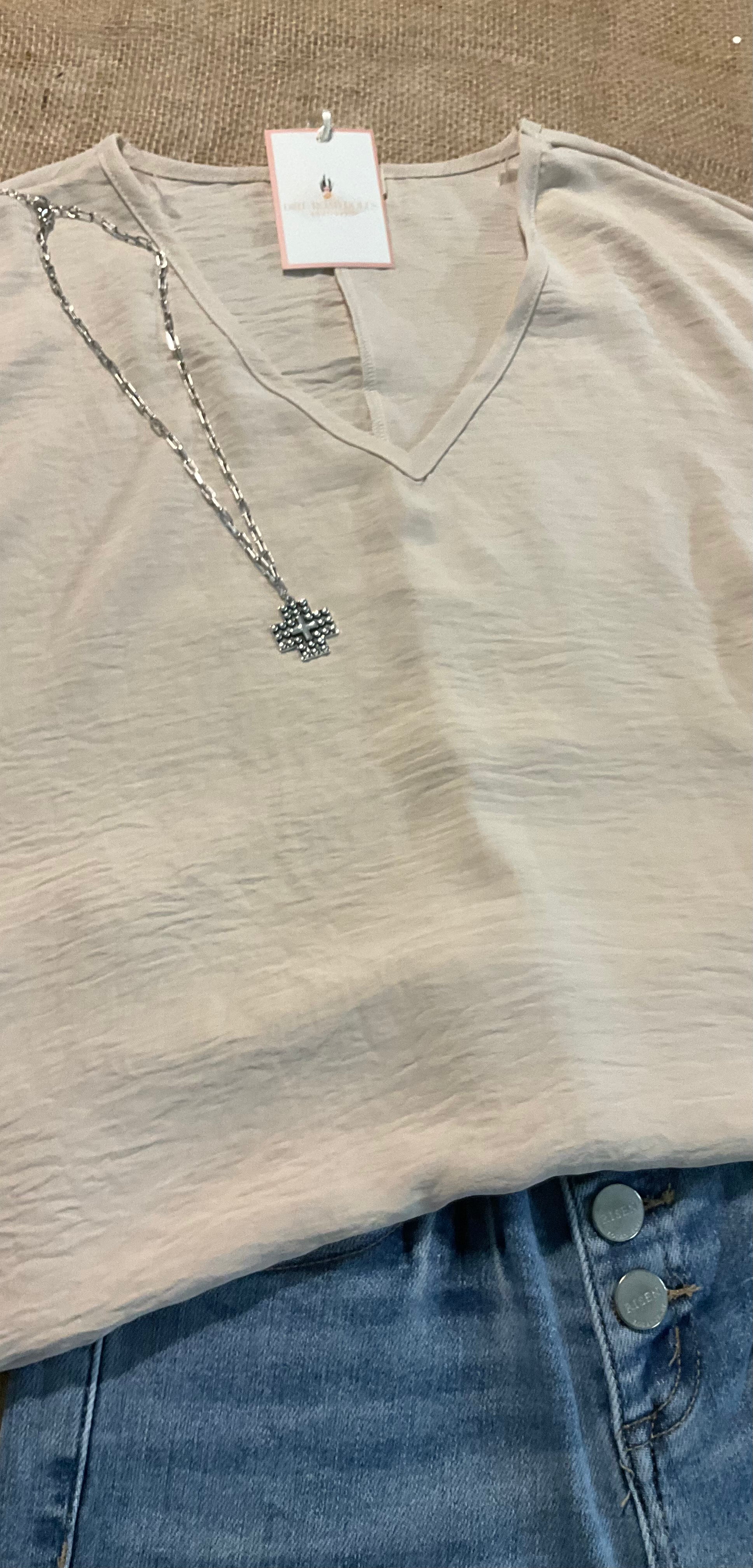 Elevate your style with our Andi Top! Featuring a flattering v-neck and short sleeves, this top is perfect for any occasion. The slightly crinkled fabric adds ease of wear, making it a must-have in your wardrobe. Dress it up or down for a versatile and effortless look.