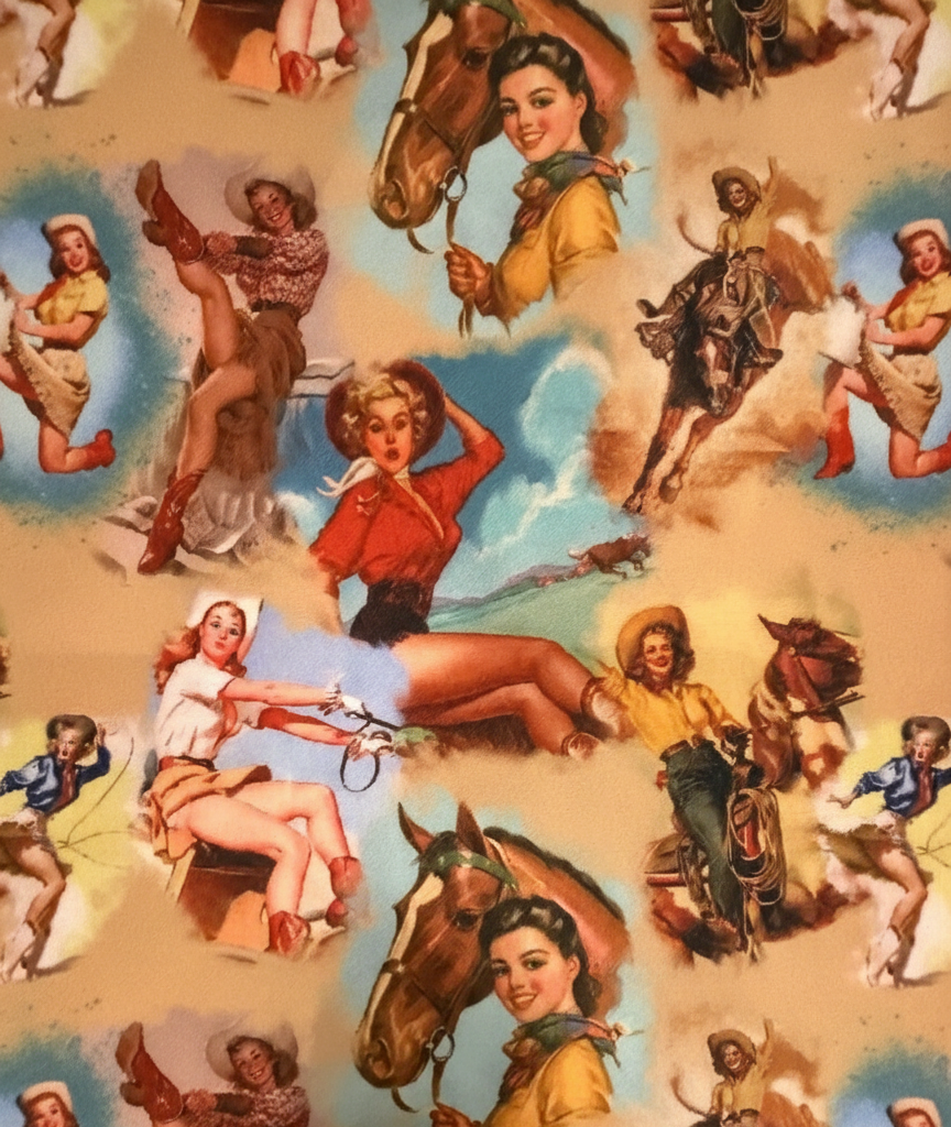 Dusty yellow base with vintage cowgirl graphics