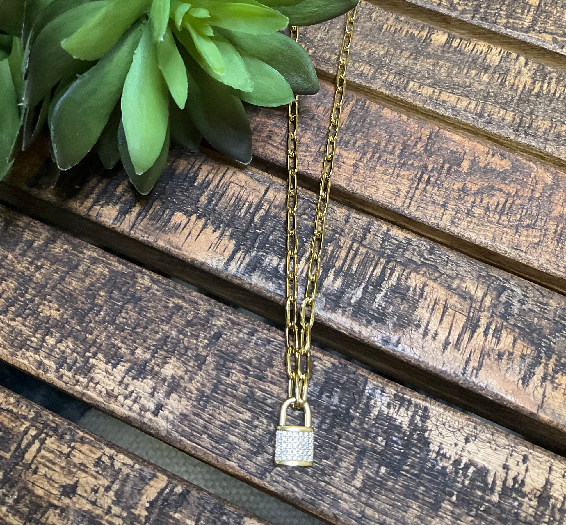 The Delia 14K Gold Dipped Necklace combines elegance and edge with its paperclip chain and sparkling CZ-accented lock pendant. Measuring 18 inches, it's the perfect length to make a statement while remaining versatile for layering. The gold-dipped finish adds a rich, polished look, making it an ideal piece for both casual and dressy outfits.
