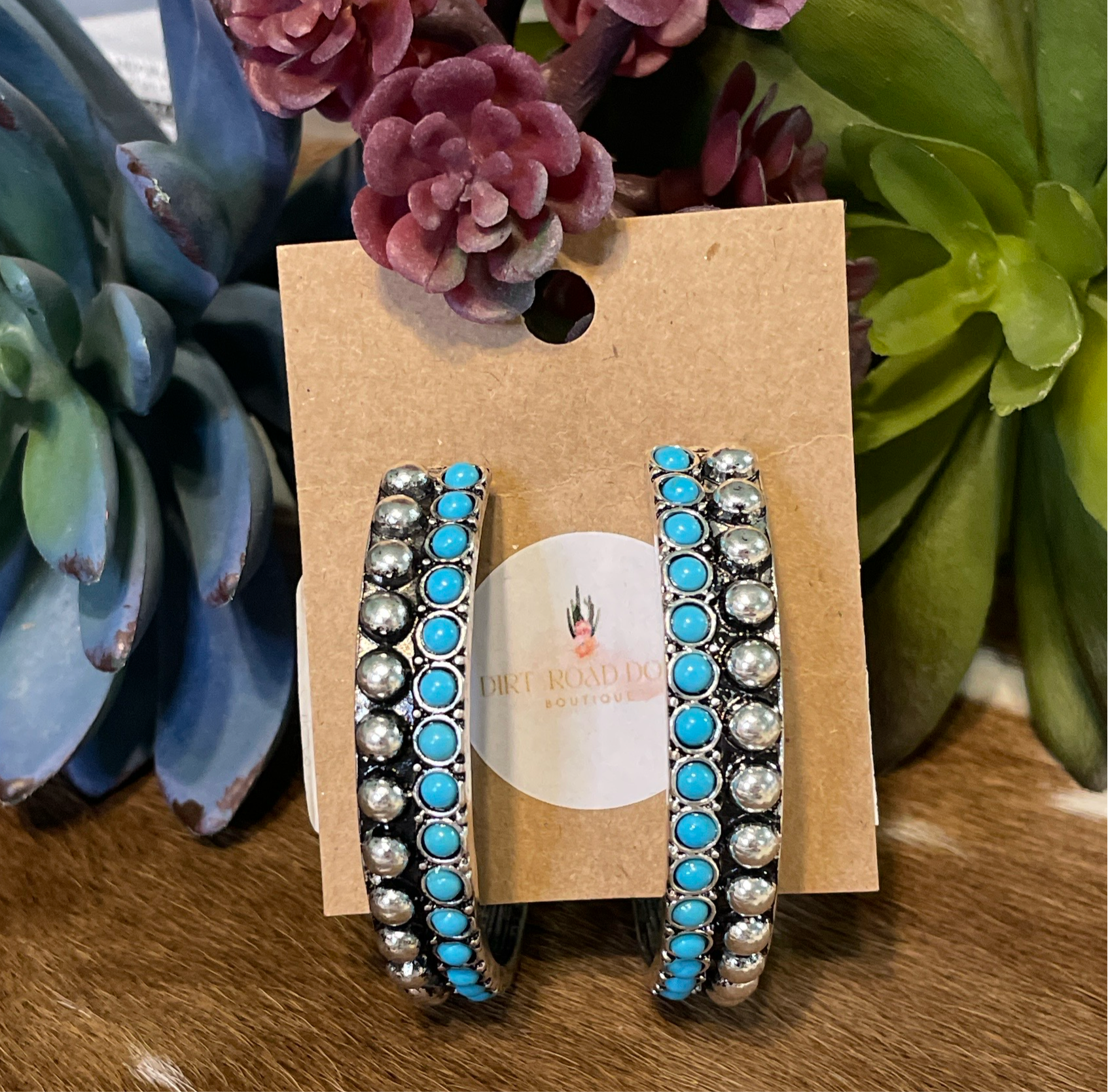 Add a touch of bohemian glamour to your look with our Double Down Earrings. The silver studded hoops perfectly complement the vibrant turquoise stones, giving you double the style in one pair of earrings. Elevate your fashion game and make a statement with these stunning earrings!