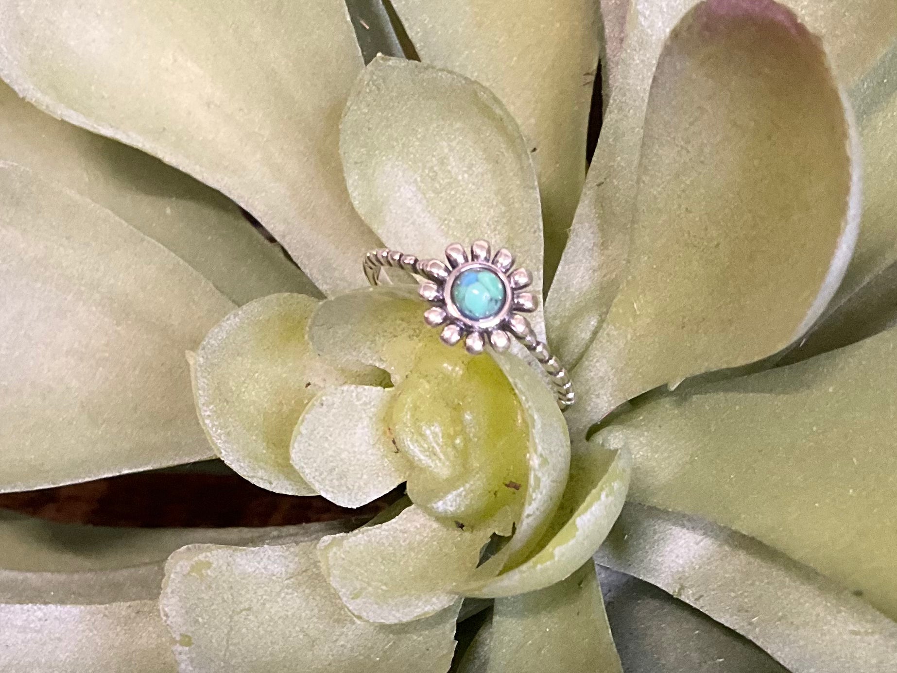 The Fauna Sterling Ring is that soft, delicate beauty you didn’t know you needed—until now. Crafted from sterling silver, it features a dainty beaded band and a tiny floral bloom made from delicate silver beading with a petite turquoise center. Feminine without being fussy, this is your new everyday ring that whispers style without screaming.