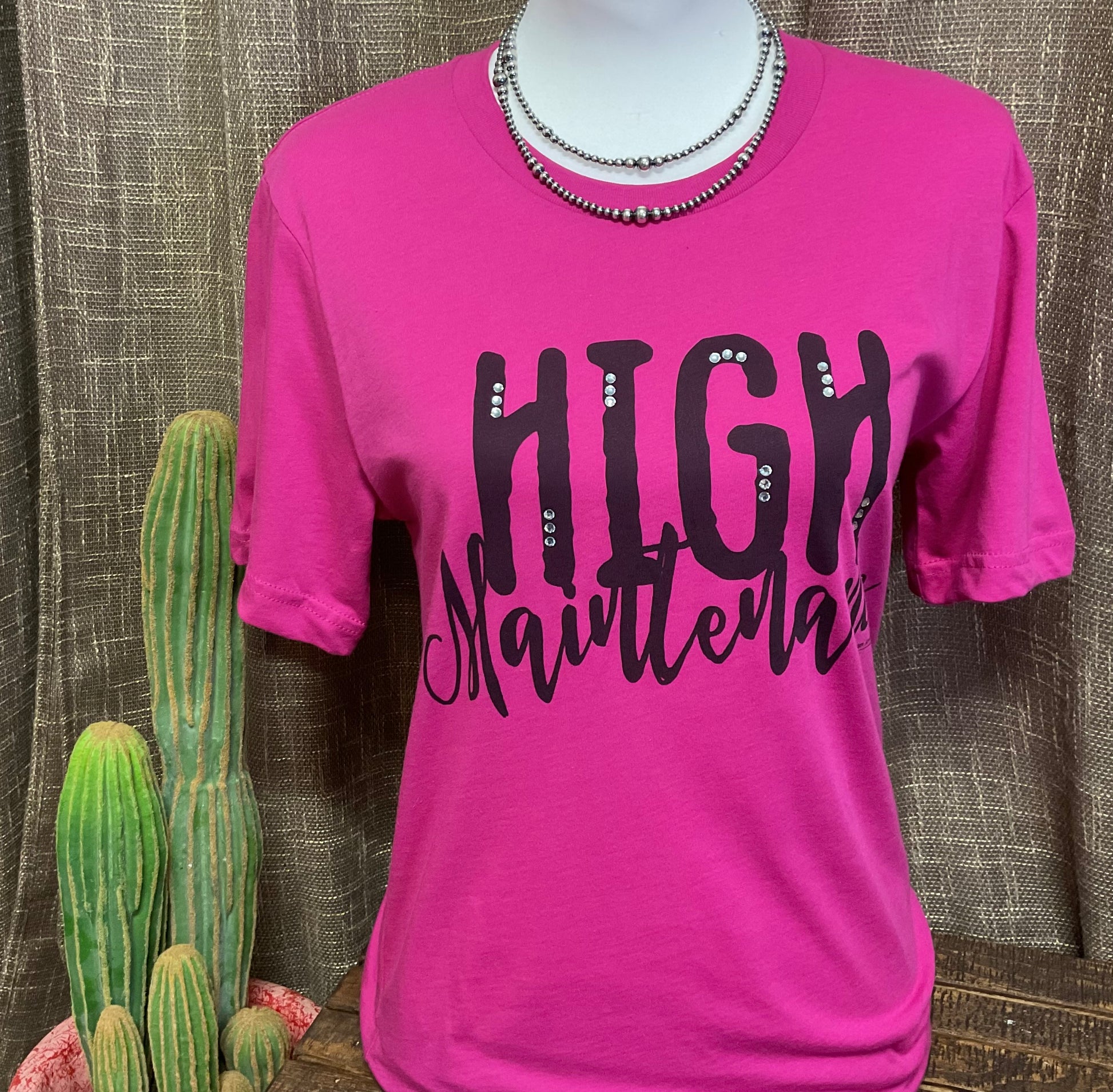 Elevate your everyday style with our High Maintenance Tee—where effortless charm meets a little extra sparkle. Crafted from ultra-soft pink fabric, this tee features bold black lettering that makes a statement without saying too much. Crystal embellishments add just the right amount of glitz, perfect for those who like their casual looks with a hint of glam.