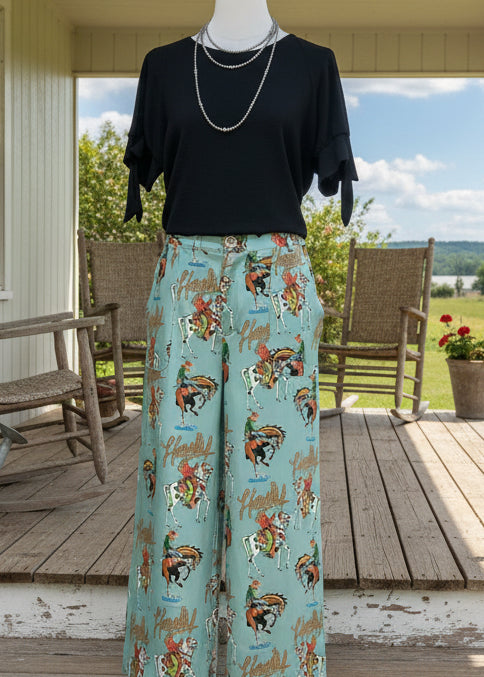 If bold, playful, and Western had a fashion baby — this would be it. The Howdy Honey Trousers are a true statement piece, featuring a lively allover Western novelty print with rodeo cowboys, broncos, and “Howdy” lettering set against a soft dusty teal background.