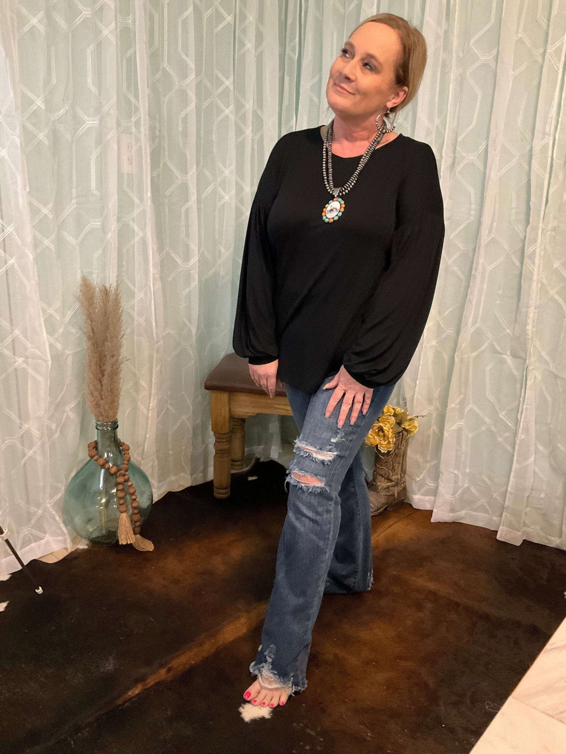 Soft feel with flowy sleeves. This top pairs well with everything - you need this in your closet!