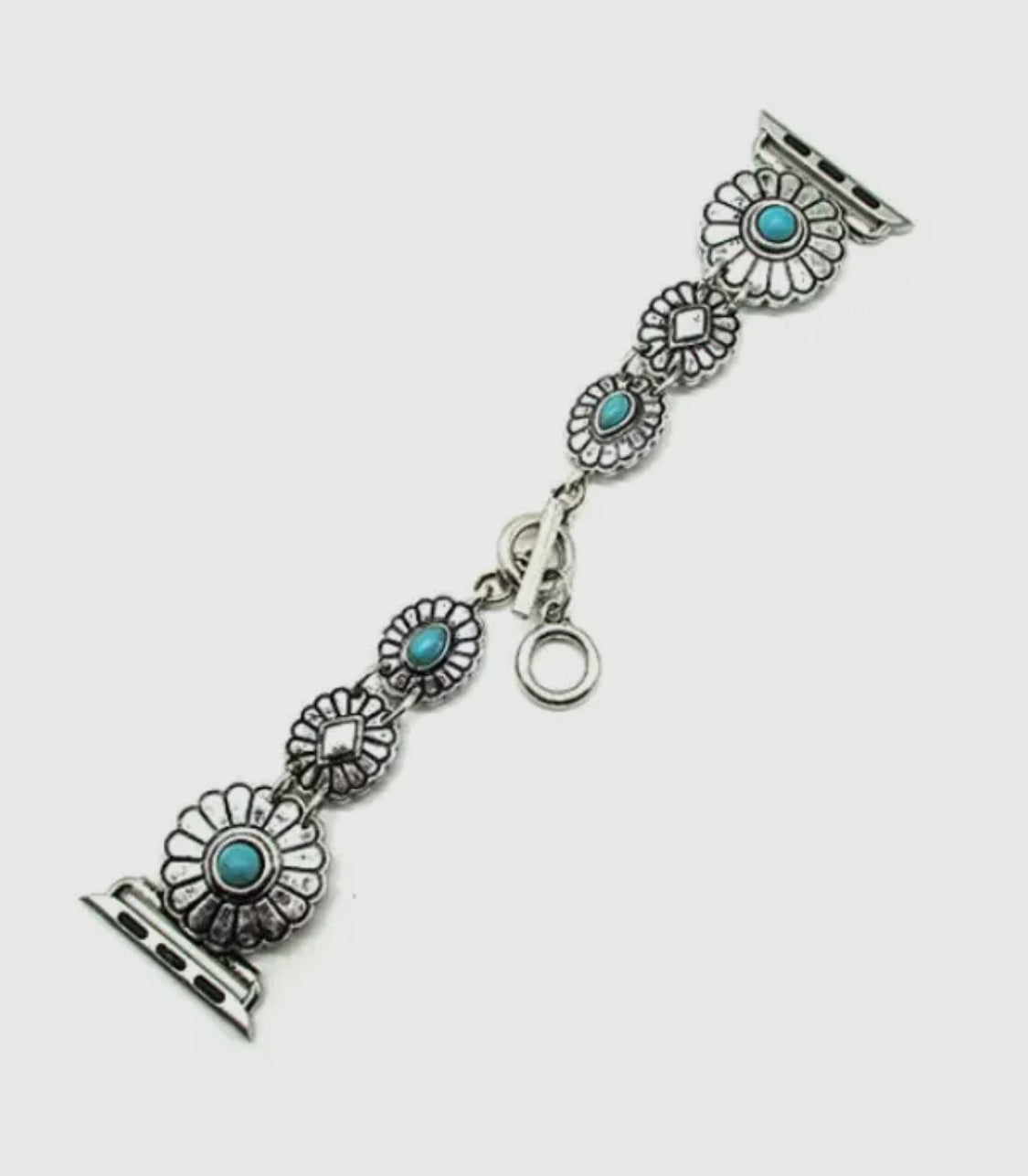 Saddle up your smartwatch with the Koda Watch Band—a silver-toned concho beauty that brings Western flair to your tech. Adorned with turquoise stones and crafted to fit Apple Watch Series 3 through 9 and SE models (38–41mm), this band strikes the perfect balance between cowgirl cool and everyday convenience. Whether you’re at the rodeo or the ranch, it’s a standout statement that keeps you on time and on trend.