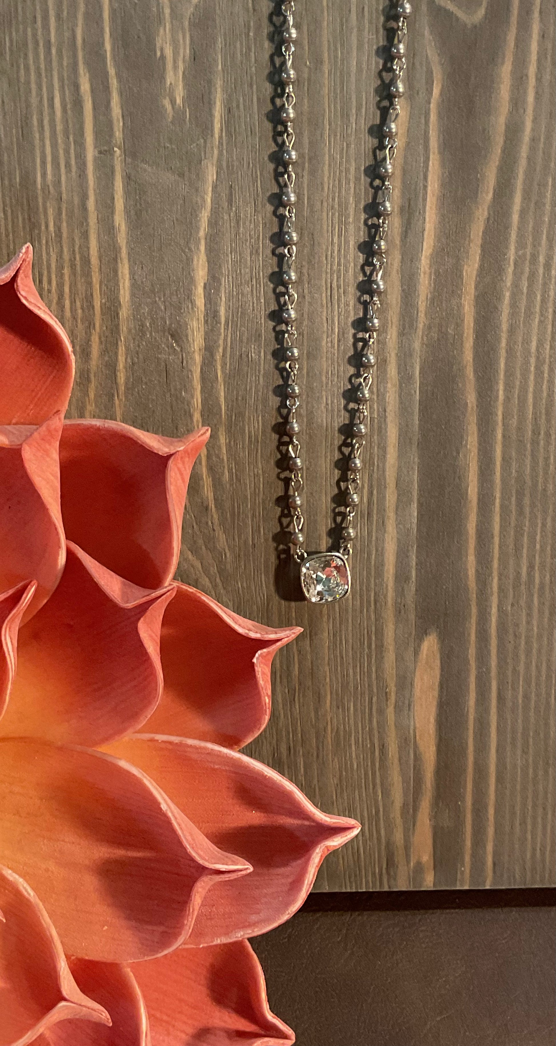 Where subtle sparkle meets custom-made luxury. The Moonset Necklace features a 12mm Austrian crystal in a cushion cut drop—set in a handcrafted Pink Panache setting made right here in the USA. The delicate linked bead chain adds just the right amount of texture, while the extender lets you style it your way.