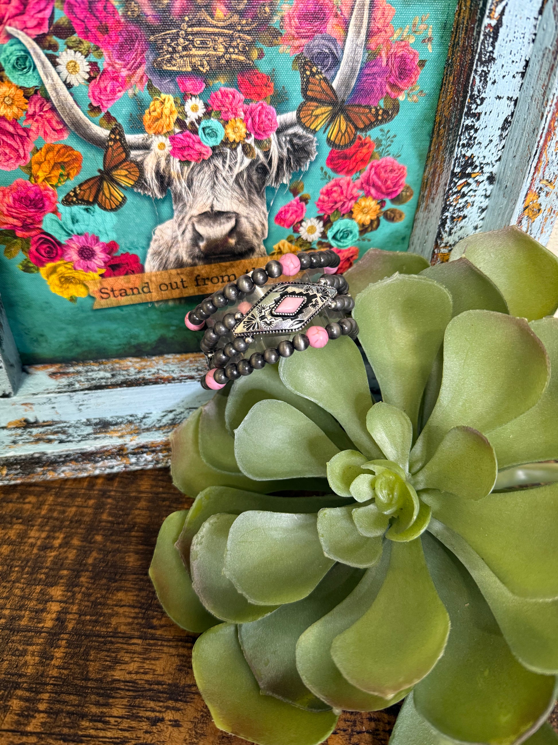 Stack up some sunset magic with the Blush Canyon Bracelet. Designed with blush-hued beads and earthy canyon tones, this bracelet captures the perfect mix of feminine charm and rugged beauty. Wear it solo for a subtle statement or layer it up for that boho-western look that turns heads.