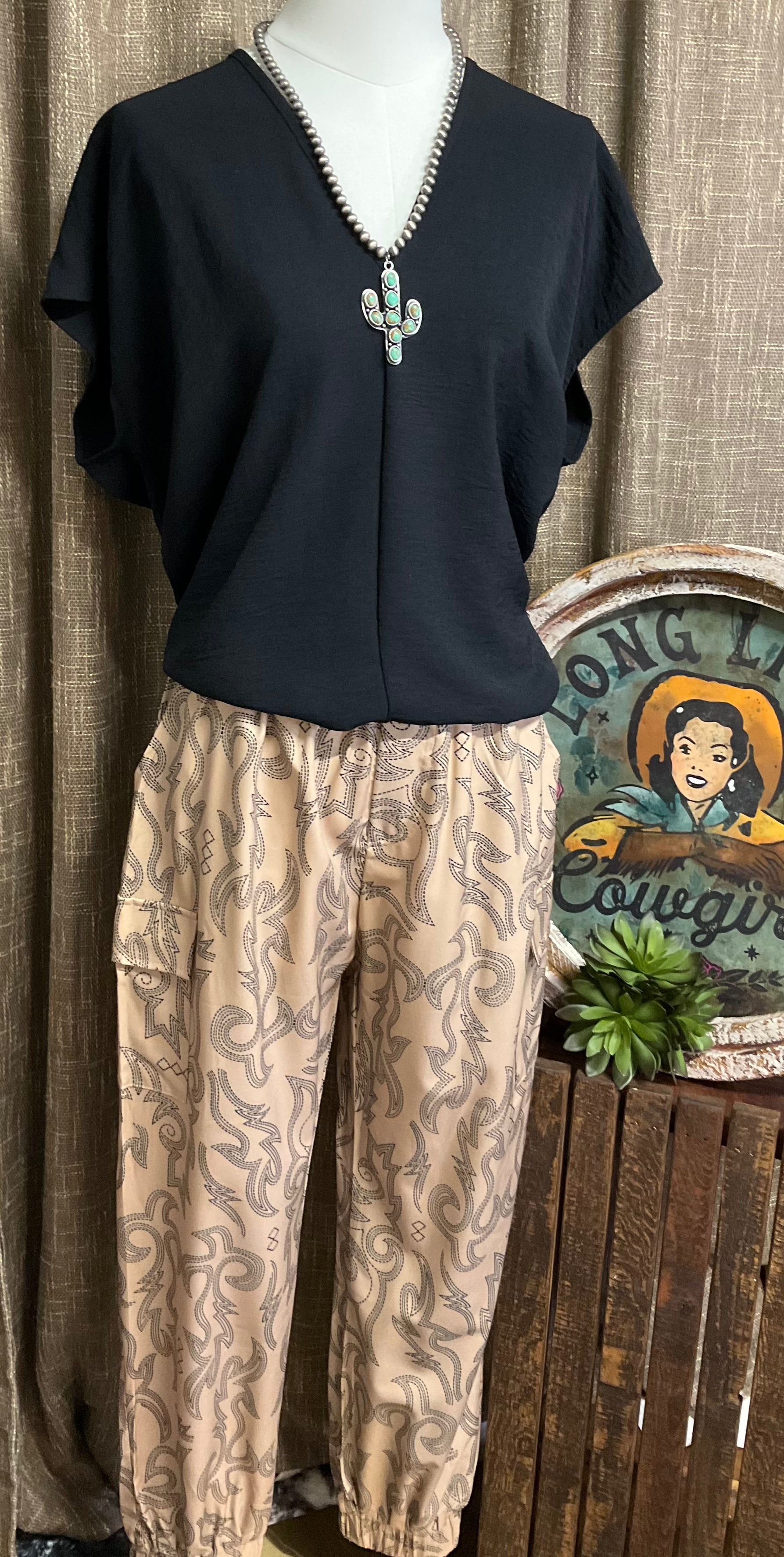 Add a touch of western flair to your everyday style with the Raquel Boot Stitch Joggers. Designed in a warm tan hue, these joggers feature an intricate boot stitch-inspired pattern that nods to classic cowboy craftsmanship. The smooth and silky fabric delivers unparalleled comfort, making them a luxurious yet laid-back staple for your wardrobe.