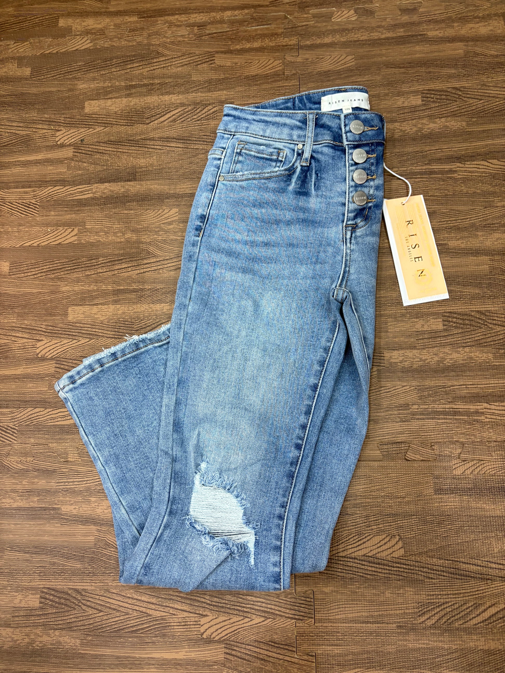 Bring the sass and the structure with the Risen Chelsea Button Down Jeans. These cropped flare jeans feature a light wash, a mid-rise fit, and an exposed button fly that adds just the right amount of retro flair. The stretchy cotton-blend fabric hugs in all the right places, while the subtle flare hem keeps things playful and polished. Designed to flatter and made for fun!