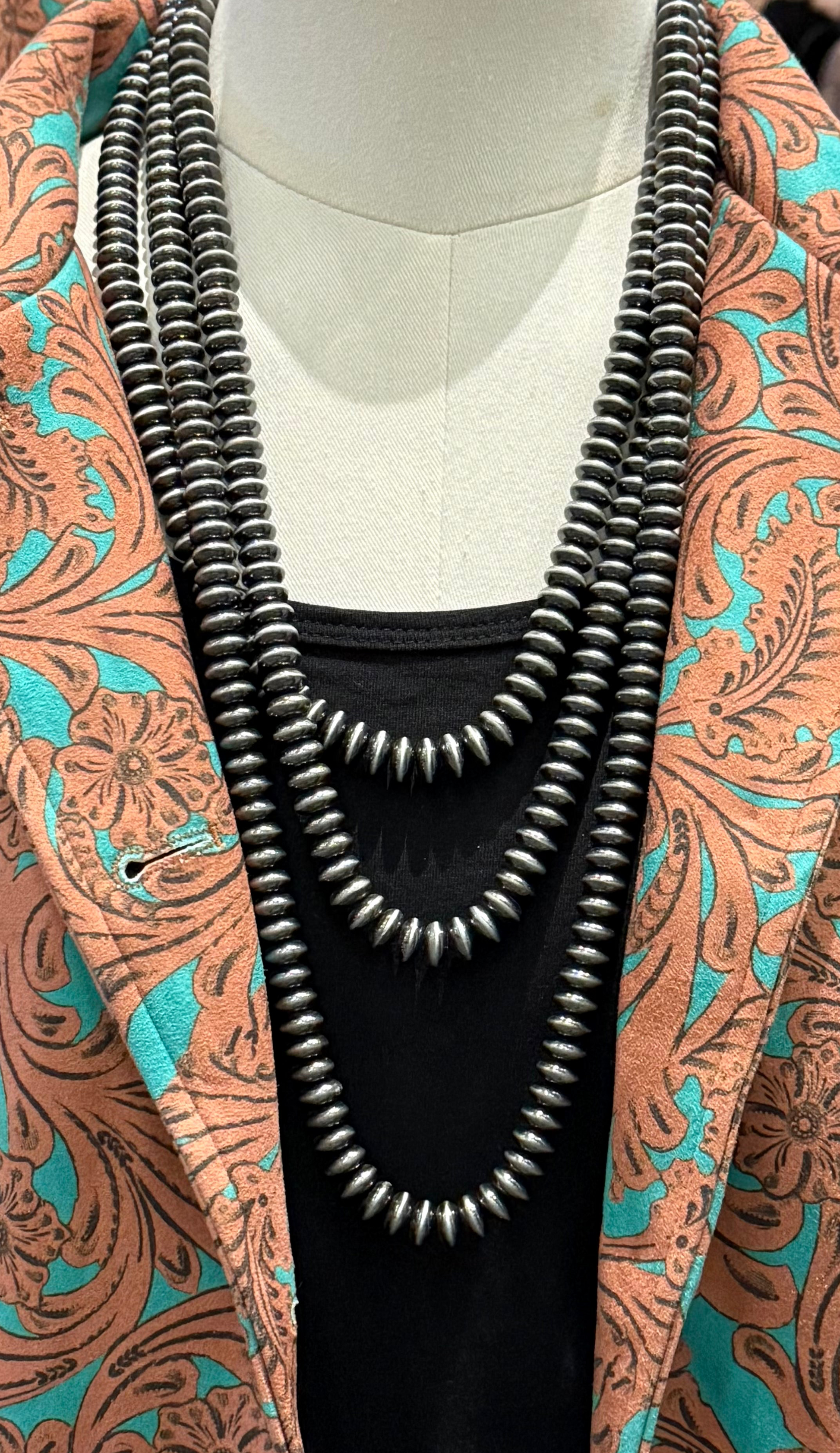 Make a statement with our Ruidoso Necklace! This stunning triple strand necklace features Navajo pearl style beads in a hot trending saucer shape. Elevate any outfit with this eye-catching accessory.