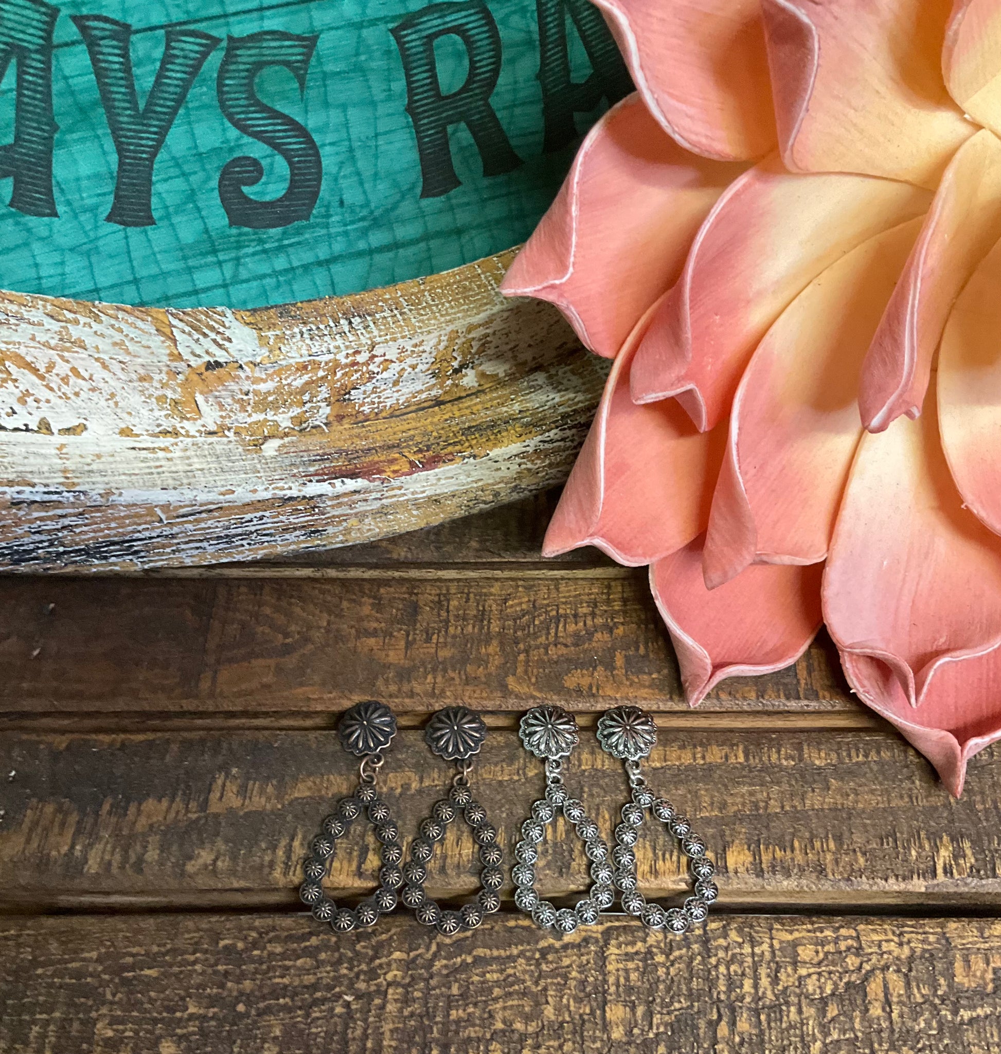 Make your moment count with the Short-Go Earrings — silver or copper toned concho posts paired with bold, dangling concho teardrops. They're playful, eye-catching, and built for a woman who knows how to turn heads whether she's ringside or roadside.