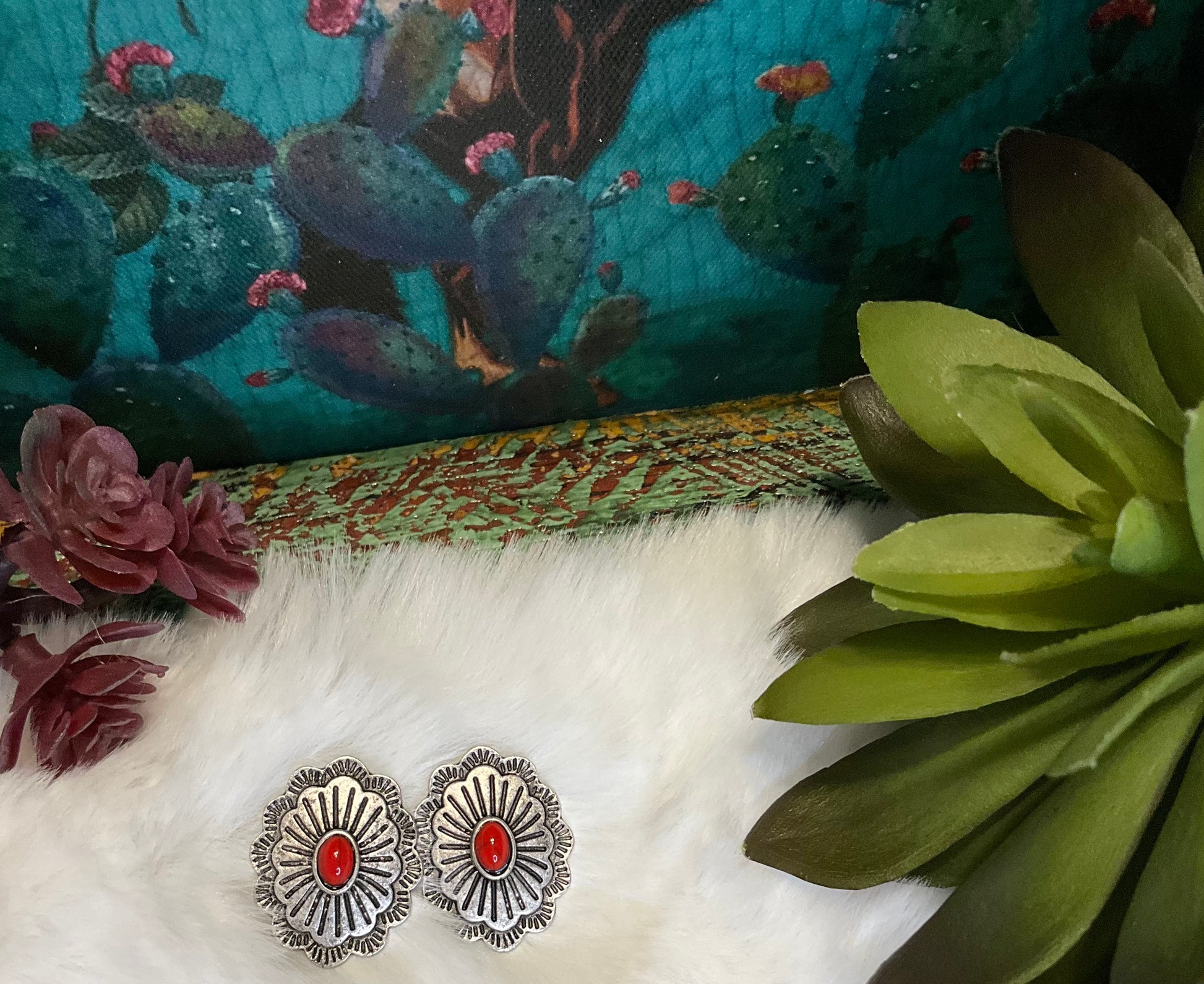 Add a touch of rustic charm to your look with our Silverton Concho Earrings. These stunning faux silver concho post earrings are beautifully detailed with a weathered, vintage-inspired design. Accented with a bold stone centerpiece, choose between vibrant turquoise or rich red to match your mood or outfit. Perfect for adding a western flair, these earrings pair well with both classic and contemporary styles.