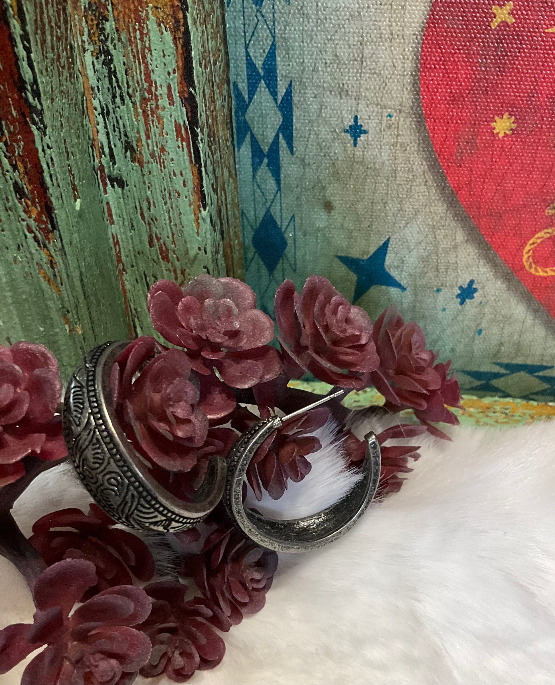 Channel timeless charm with the Springer Earrings. These antique silver-toned hoops feature intricate western-inspired etching, adding a rustic yet elegant touch to your look. Lightweight and versatile, they are perfect for everyday wear or when you want to infuse your outfit with a bit of western flair.