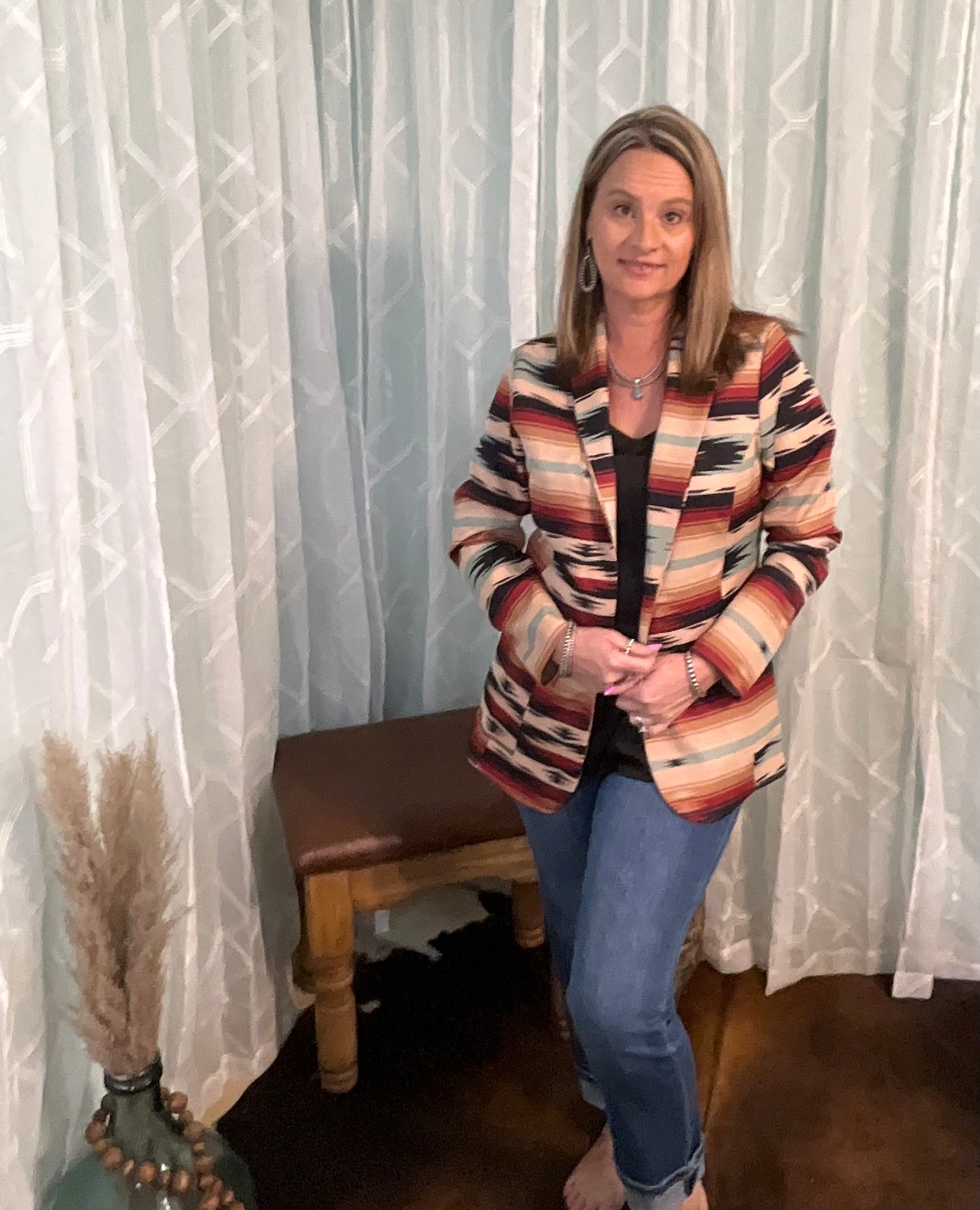Introducing The Aztec Blazer: because you KNOW you want to go Rodeo Ready! Whether you're a cowgirl or a city slicker, this stylish blazer adds a bit of western flair to your wardrobe. It's a head-turner that's sure to help you make your mark. Saddle up, and look great doin' it!