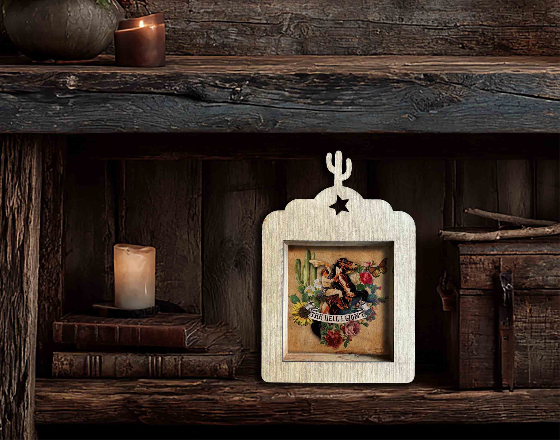 Add a splash of rustic attitude to your space with The Hell I Won't Cowgirl Nicho Frame. Measuring approximately 10” x 15” x 2”, this playful shadowbox can stand proudly on any surface or hang on your wall. Perfect for cowgirls who know how to make a statement with a wink and a smile.