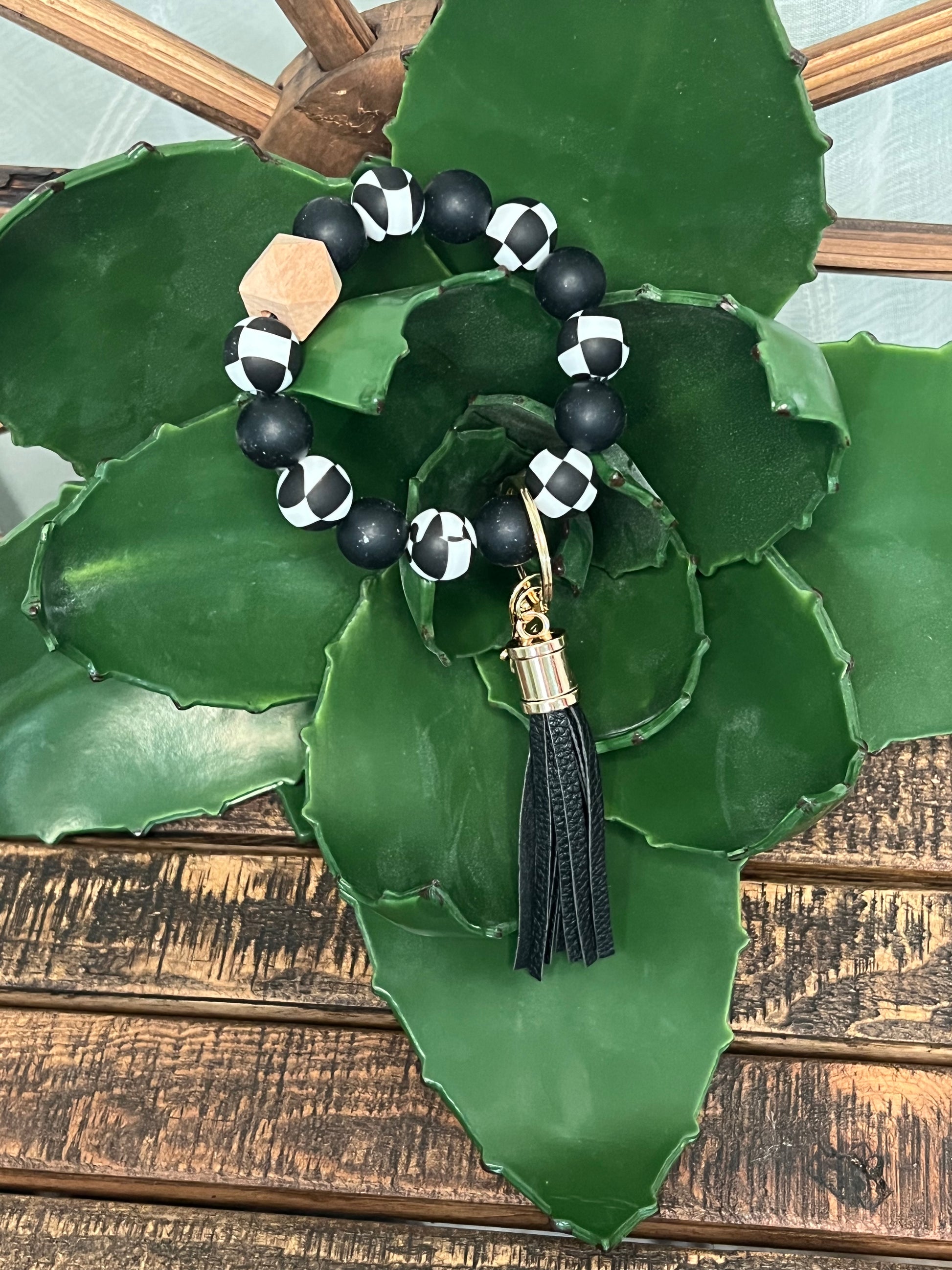 Elevate your style and convenience with The Race Is On Wristlet Keychain. The silicone beaded stretch wristlet adds a splash of color while keeping your keys secure. The black and white checkered beads add a touch of race-inspired flair, while the tassel adds a playful twist. Stay organized and stylish on the go!