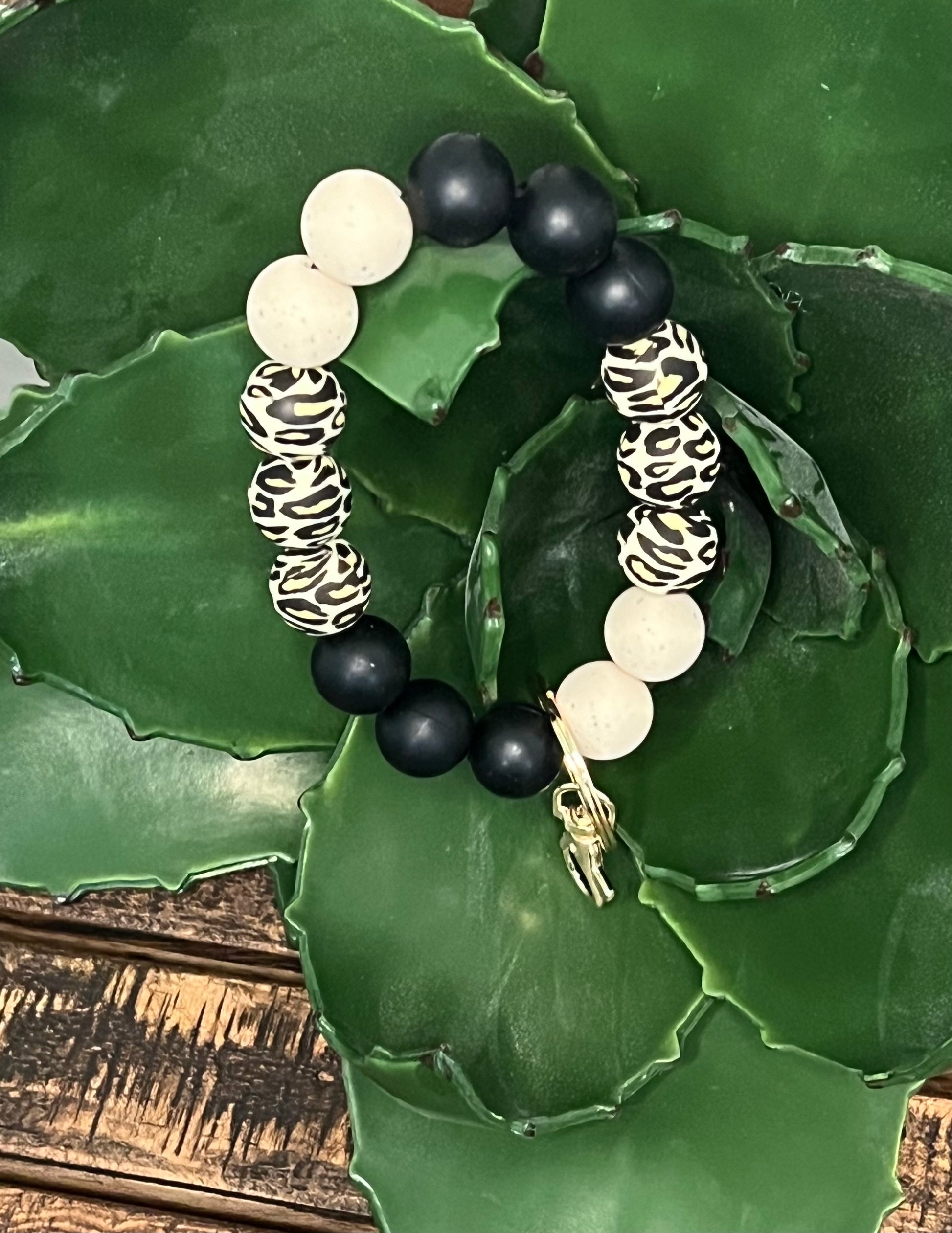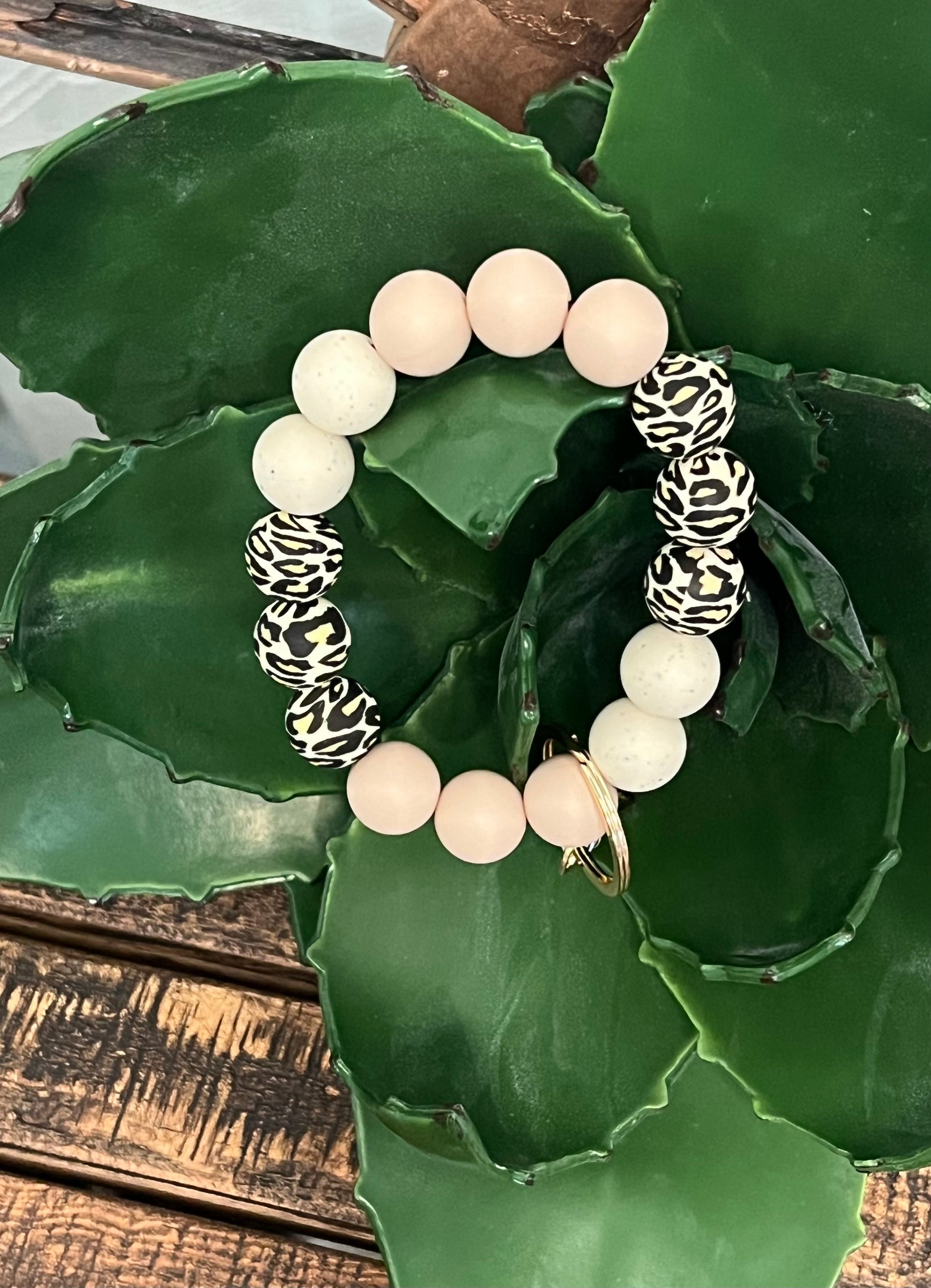 Keep your keys close and your style on point with the Wild Child Wristlet Keychain. This silicone beaded bracelet is both functional and trendy. Featuring neutral, black, and leopard beads, it's the perfect addition to any outfit. Never lose your keys again with this versatile keychain.